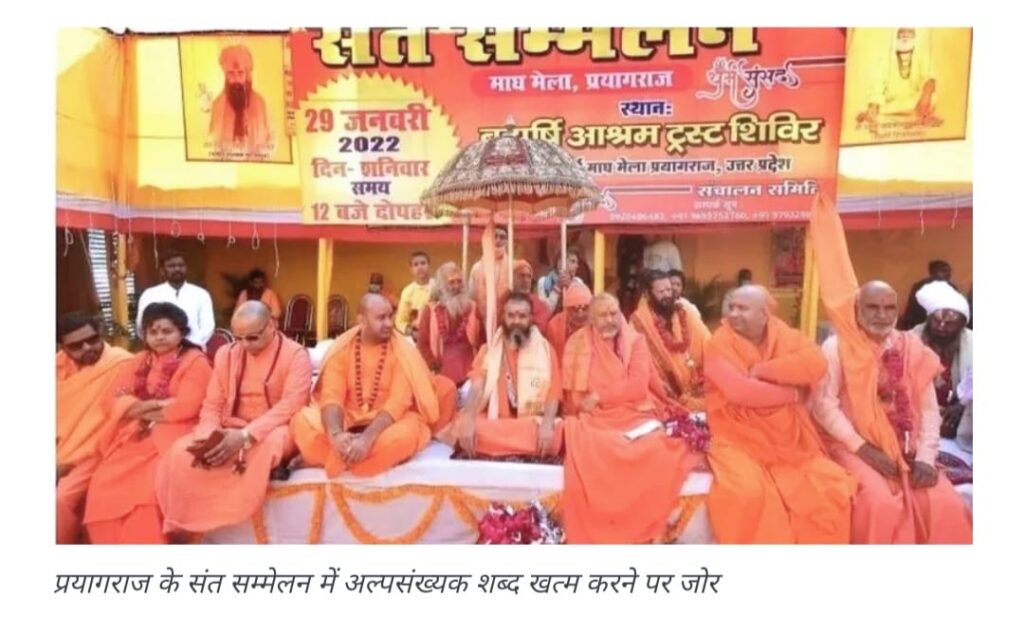 प्रयागराज के संत सम्मेलन में अल्पसंख्यक शब्द खत्म करने पर जोर-‘हमारे दो धर्म योद्धाओं को रिहा किया जाए, वरना भयानक होंगे परिणाम’,संत सम्मलेन में चेतावनी, ‘हिन्दू राष्ट्र’ घोषित करने की माँग