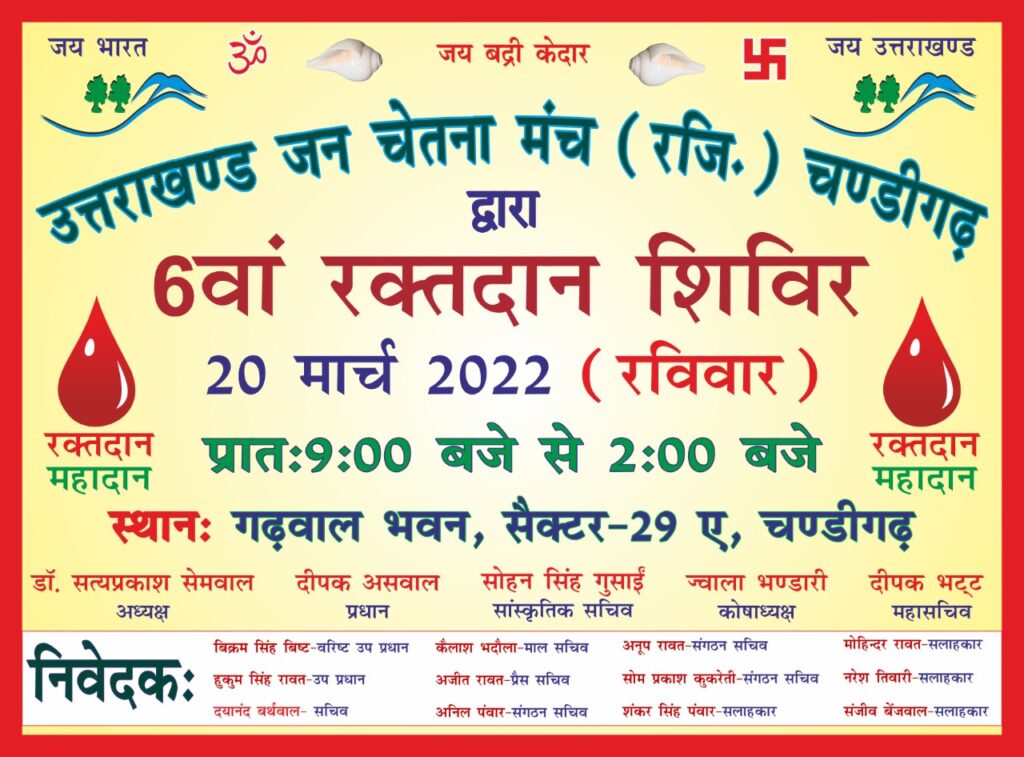 उत्तराखंड जन चेतना मंच रजिस्टर्ड चंडीगढ़ हर वर्ष की भांति इस वर्ष भी रविवार 20 मार्च 2022 को गढ़वाल भवन परिसर सेक्टर 29 चंडीगढ़ में युवा वर्ग को रक्तदान करने के लिए प्रेरित करने के उद्देश्य से रक्तदान शिविर का आयोजन करने जा रहा है। ट्राइसिटी चंडीगढ़ के सभी सामाजिक वर्ग को यह भली-भांति विदित है कि उत्तराखंड जन चेतना मंच अपने चिरकाल से ही समाज सेवा को समर्पित अनेकों प्रकार के कार्यक्रमों का आयोजन करता रहा है इसी उद्देश्य को आगे बढ़ाते हुए मंच रविवार 20 मार्च 2022 को प्रातः 9:00 बजे से दोपहर 2:00 बजे तक गवर्नमेंट मेडिकल कॉलेज एंड हॉस्पिटल सेक्टर 32 चंडीगढ़ के सहयोग के अंतर्गत युवाओं को रक्तदान के लिए प्रेरित करने के उद्देश्य से इस रक्तदान शिविर का आयोजन करने जा रहा है रक्तदान महादान के इस एक छोटे से शब्द की महानता से तो सभी लोग परिचित है परंतु फिर भी सभी सामाजिक संस्थाओं का दायित्व बनता है कि हम दिन प्रतिदिन अपनी युवा पीढ़ी को रक्तदान महादान के महत्व के बारे में जागरूक करते रहे कि रक्तदान करने से आप अपनों की ही नहीं बल्कि कई मासूम जिंदगियों को बचाने में अपना अहम योगदान अदा कर सकते हैं इस प्रकार का उद्देश्य एक का नहीं बल्कि हर देशवासी का होना चाहिए तभी हम रक्त के प्रति अस्पतालों में जूझ रही कई असहाय जिंदगीयों को बचा सकते हैं मंच के मीडिया प्रभारी अजित सिंह रावत द्वारा बताया गया कि इस रक्तदान शिविर में ट्राइसिटी चंडीगढ़ की सभी सामाजिक संस्थाओं के पदाधिकारी एवं सदस्यगण अपनी अपनी भूमिकाओं का निर्वहन करते हुए उपस्थित रहेंगे इस उद्देश्य पूर्ति के लिए उत्तराखंड जन चेतना मंच सभी युवा वर्ग के रक्तदाताओं से विनम्र निवेदन करता है कि इस रक्तदान शिविर में बढ़-चढ़कर भाग लेकर इस कार्यक्रम को सफल बनाने में अपनी अपनी भूमिकाओं का निर्वहन करें और रक्त के लिए अस्पतालों में जूझ रही अनेकों अनेक जिंदगीयों का सहारा बन कर पुण्य प्राप्त करें धन्यवाद।